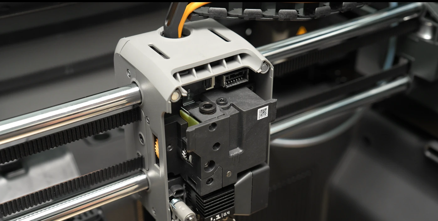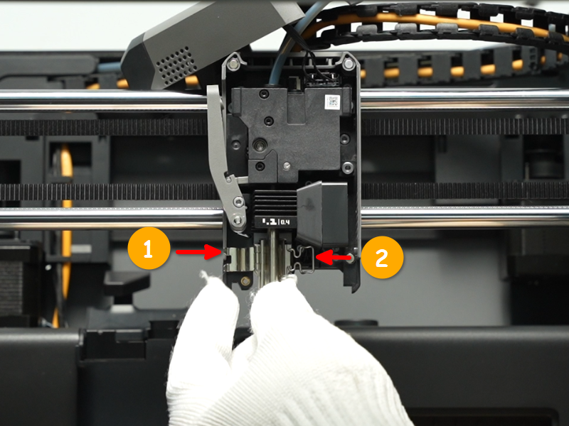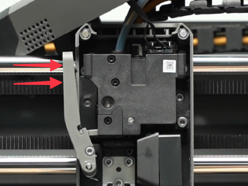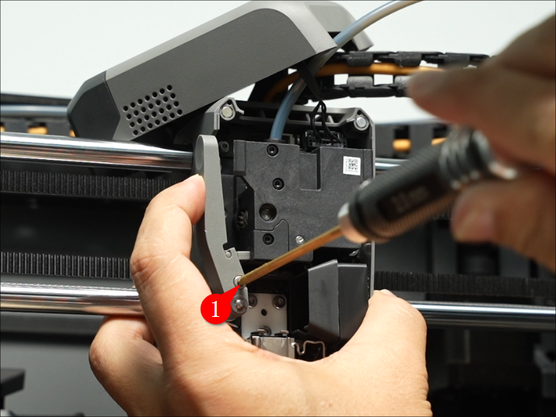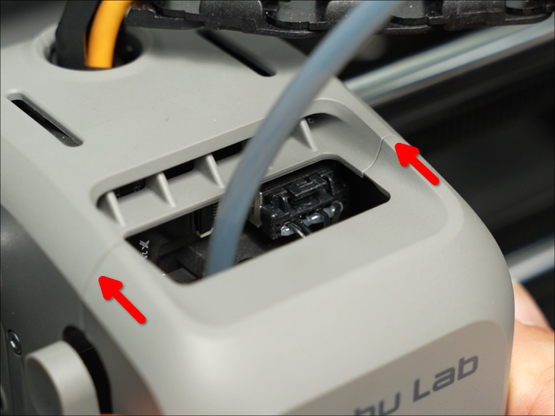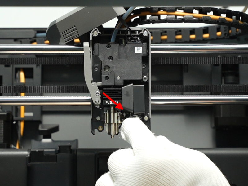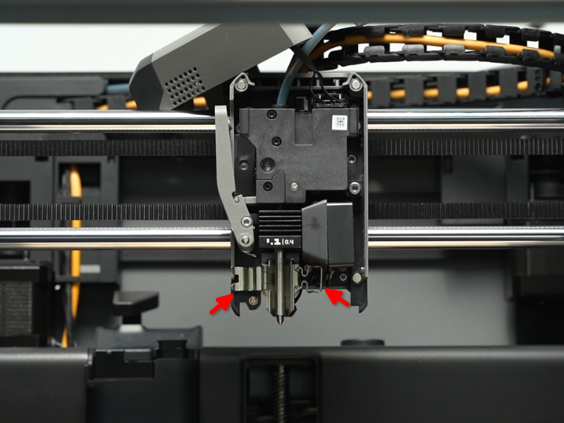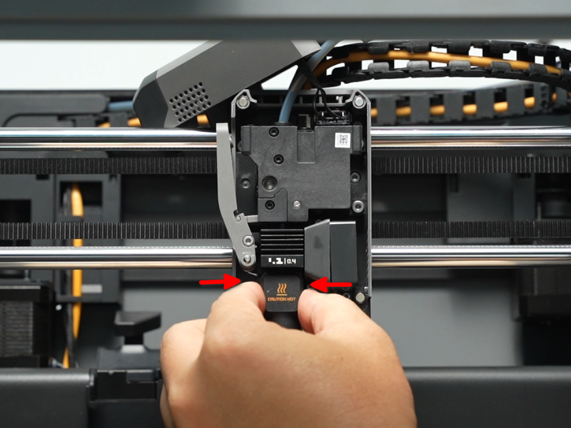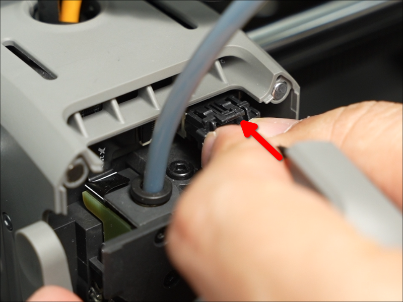 เปิดฝาครอบหัวพิมพ์: เปิดฝาครอบด้านหน้าของหัวพิมพ์ (Toolhead) จากนั้นกดสลักขั้วต่อเพื่อดึงปลั๊กออก และถอดฝาครอบด้านหน้าออก