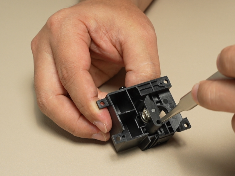 ถอดชิ้นส่วนภายใน: ถอดชุดสปริงดันเส้น, เฟือง (Idler Gear) และชิ้นส่วนอื่นๆ ออกจากฝาครอบด้านหน้าของ Extruder