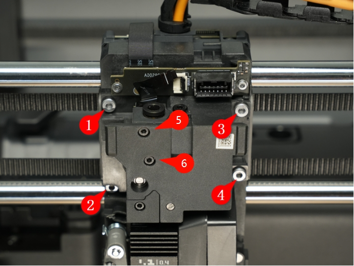 ถอดสกรูยึด Extruder: ถอดสกรู 4 ตัว (หมายเลข 1, 2, 3, 4) ที่ยึดตัว Extruder และสกรูอีก 2 ตัว (หมายเลข 5, 6) ที่ยึดเซ็นเซอร์เส้นพลาสติก (Filament Sensor)