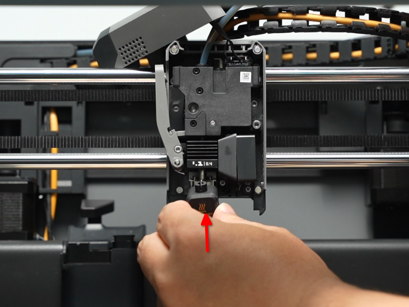 ติดตั้งหัวฉีด (Nozzle): ตรวจสอบให้แน่ใจว่าคลิปหัวฉีดเปิดอยู่จนสุด จากนั้นติดตั้งหัวฉีดกลับเข้าไปที่ชุดทำความร้อน (Hotend Heating Assembly)