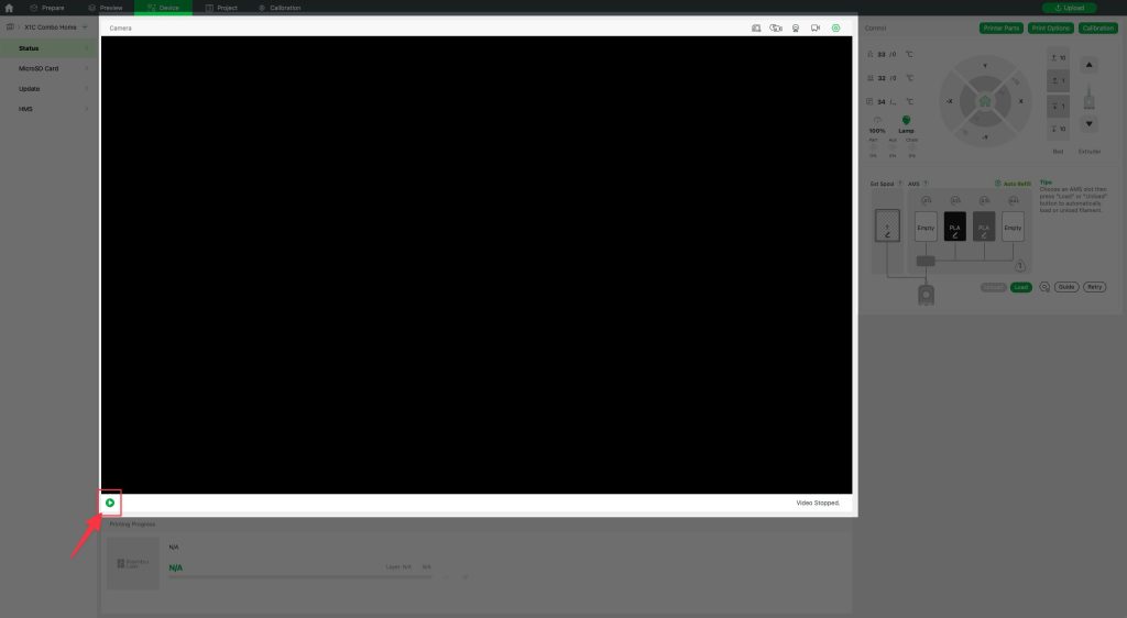 จุดเด่นของเครื่อง Bambulab ก็คือกล้อง ที่สามารถที่จะ Remote เข้ามาดูการทำงาน รวมไปถึงตัวกล้อง ยังสามารถที่จะบันทึกวิดีโอเป็น Timelapse ในช่วงที่กำลังปริ้นงานอยู่ได้ ซึ่งการดูกล้องผ่านโปรแกรม สามารถทำได้ โดยการกดปุ่ม Play