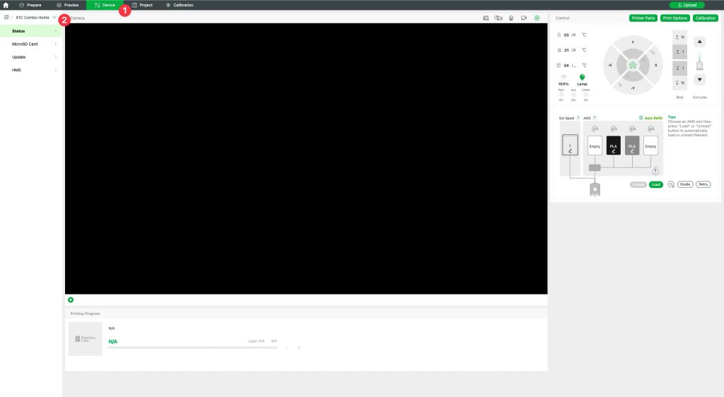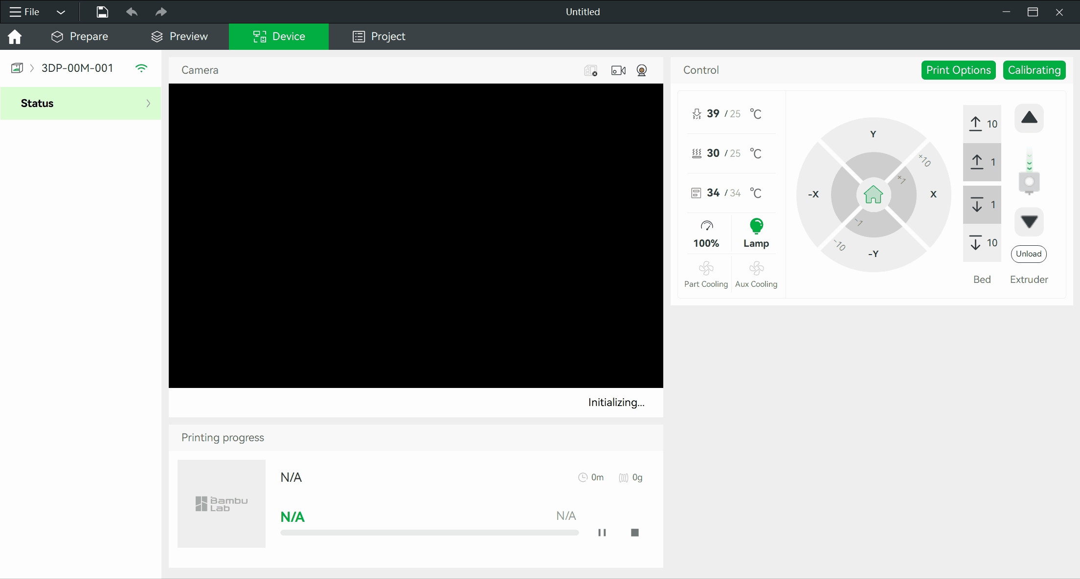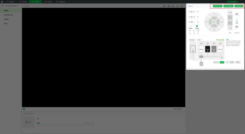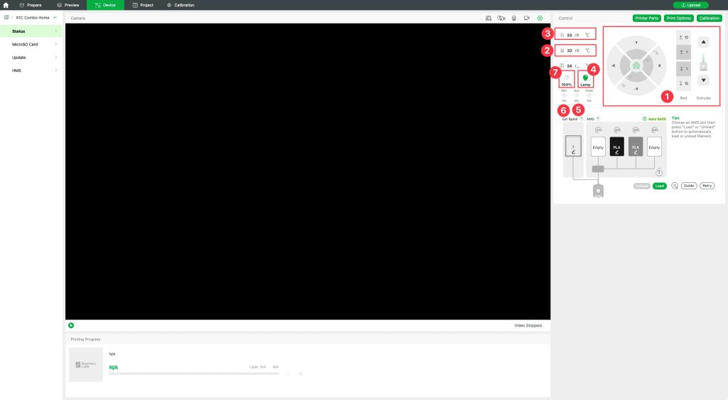 ตัวโปรแกรม Bambu Studio สามารถที่จะสั่งให้เครื่องทำงานจากระยะไกลได้ สามารถที่เปลี่ยนความร้อนของหัวฉีด และฐานพิมพ์ได้ รวมไปถึงปรับค่าความเร็วในการพิมพ์ของเครื่องได้ ผ่านแทบหน้าต่าง Device ได้เลย ซึ่งตัวที่สามารถจะปร้บค่าและควบคุมได้มีดังนี้้