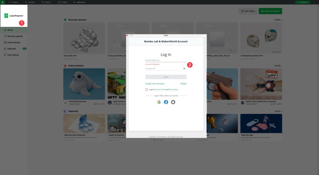 ก่อนที่จะใช้งานฟีเจอร์ตรงนี้ได้ จำเป็นที่จะต้องไปสร้างบัญชี หรือ Account กับทาง Bambulab ก่อน ซี่งวิธีการสามารถเข้าไปอ่านได้ที่ ขั้นตอนการลงทะเบียน หลังจากได้ User name และ Password แล้วให้นำมาใส่ในโปรแกรม Bambu Studio ในแทบรูปบ้าน