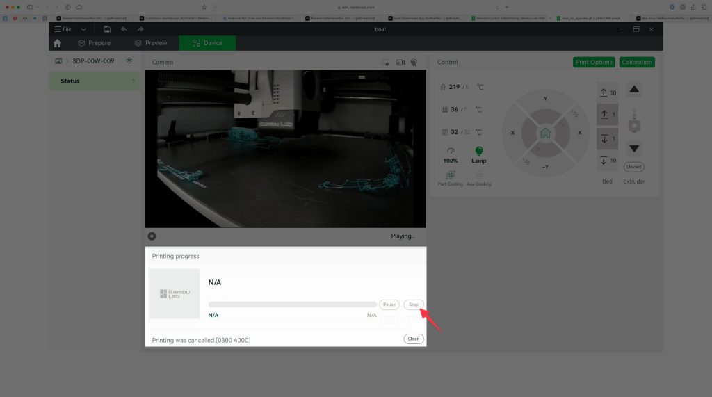 ในกรณีที่สั่งเครื่องปริ้นไปแล้ว เกิดยากจะยกเลิก หรือเข้ามาดูแล้วงานปริ้นเสีย สามารถที่จะสั่งยกเลิกได้ผ่านโปรแกรม โดยที่ไม่ต้องเดินไปที่หน้าเครื่องเพื่อกดสั่งหยุด ซึ่งสามารถทำได้โดยการกดปุ่ม Stop ที่ Printing Progess