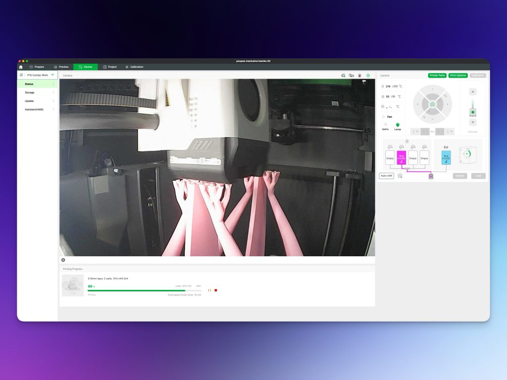 ตัวโปรแกรม Bambu Studio สามารถที่จะสั่งให้เครื่องทำงานจากระยะไกลได้ สามารถที่เปลี่ยนความร้อนของหัวฉีด และฐานพิมพ์ได้ รวมไปถึงปรับค่าความเร็วในการพิมพ์ของเครื่องได้ ผ่านแทบหน้าต่าง Device ได้เลย ซึ่งตัวที่สามารถจะปร้บค่าและควบคุมได้มีดังนี้้