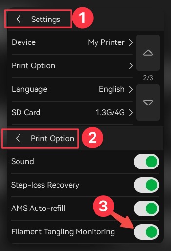 สำหรับเมนูการเปิด-ปิด จะอยู่ในหน้า Setting > Print Option ให้มองหาคำสั่ง Filament Tangling Monitoring แล้วเปิดฟีเจอร์นี้ไว้