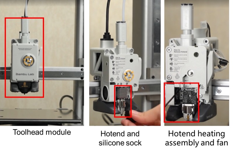 สำหรับหัวฉีดเครื่องรุ่นนี้ เป็นแบบ Hot Swap เน้นเปลี่ยนง่าย และเปลี่ยนเร็ว ไม่ต้องใช้เครื่องมือในการเปลี่ยน หัวฉีดจะมาเป็นแบบประกอบเสร็จในชิ้นเดียว มีขนาดรูให้เลือกหลายขนาด แต่ที่ติดมากับเครื่องจะมีขนาดรู 0.4 มิลลิเมตร ตัวทำความร้อนแลเซนเซอร์วัดความร้อน จะไม่ได้อยู่ติดกับหัวฉีด แต่จะเป็นโมดูลแยกอีกชิ้น ซึ่งจะอยู่ด้านหลังของชุดหัวฉีด ด้านข่างหัวฉีดจะมีพัดลมที่เรียกว่า Hotend Fan มีหน้าที่เป่าซิงค์ระบายความร้อนหัวฉีด ถ้าพัดลมชิ้นนี้เสีย หรือไม่หมุน จะทำให้หัวฉีดตันได้ ตัวฮีทเตอร์ให้ความร้อน จะมีซิลิโคนสีดำหุ้มอยู่ ซิลิโคนช่วยให้ ความร้อนในหัวฉีดนิ่ง ไม่สวิงไปมา และยังช่วยลด เศษพลาสติก ติดที่หัวฉีด