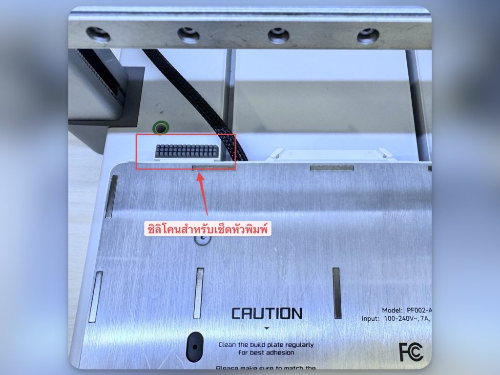 สำหรับด้านหลังของฐานปริ้น จะมียางซิลิโคน มีหน้าที่เช็ดหัวพิมพ์ ก่อนที่เครื่องจะทำการปริ้น และวัดฐาน เครื่อง A1 Combo มีระบบวัดฐานปริ้นแบบอัตโนมัติ ที่จะใช้หัวฉีดกดลงไปที่ฐานปริ้น ก่อนปริ้นทุกครั้ง ดังนั้นหัวปริ้น ต้องสะอาดไม่มีเศษพลาสติกติดที่หัว การทำความสะอาดหัวฉีด จึงจำเป็นสำหรับเครื่อง A1 Combo