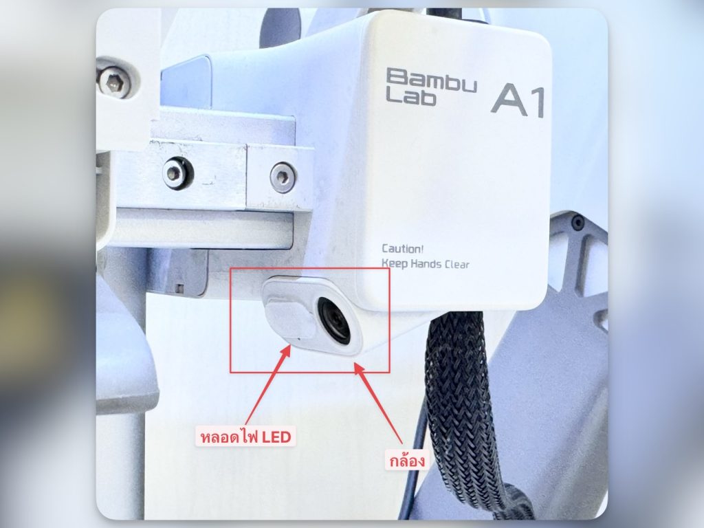 ตัวเครื่องรุ่น A1 ทุกรุ่น จะมีกล้องสำหรับถ่ายวิดีโอ Timelapse และยังเป็นกล้องดูผ่าน App Bambu Handy และโปรแกรม Bambu Studio เพื่อดูการทำงานแบบ Real Time ในกรณีที่ต่อเครื่องเข้ากับ Internet ตัวกล้องสามารถที่จะปิดได้ โดยหมุนฝาปิดด้านข้าง มาปิดหน้าเลนส์ เพื่อปกป้องความเป็นส่วนตัว ด้านข้างของกล้องจะมีหลอดไฟ LED เพื่อเพิ่มความสว่าง สามารถที่จะสั่งเปิด ปิดได้ผ่าน App หรือหน้าจอ Touch Screen ก็ได้