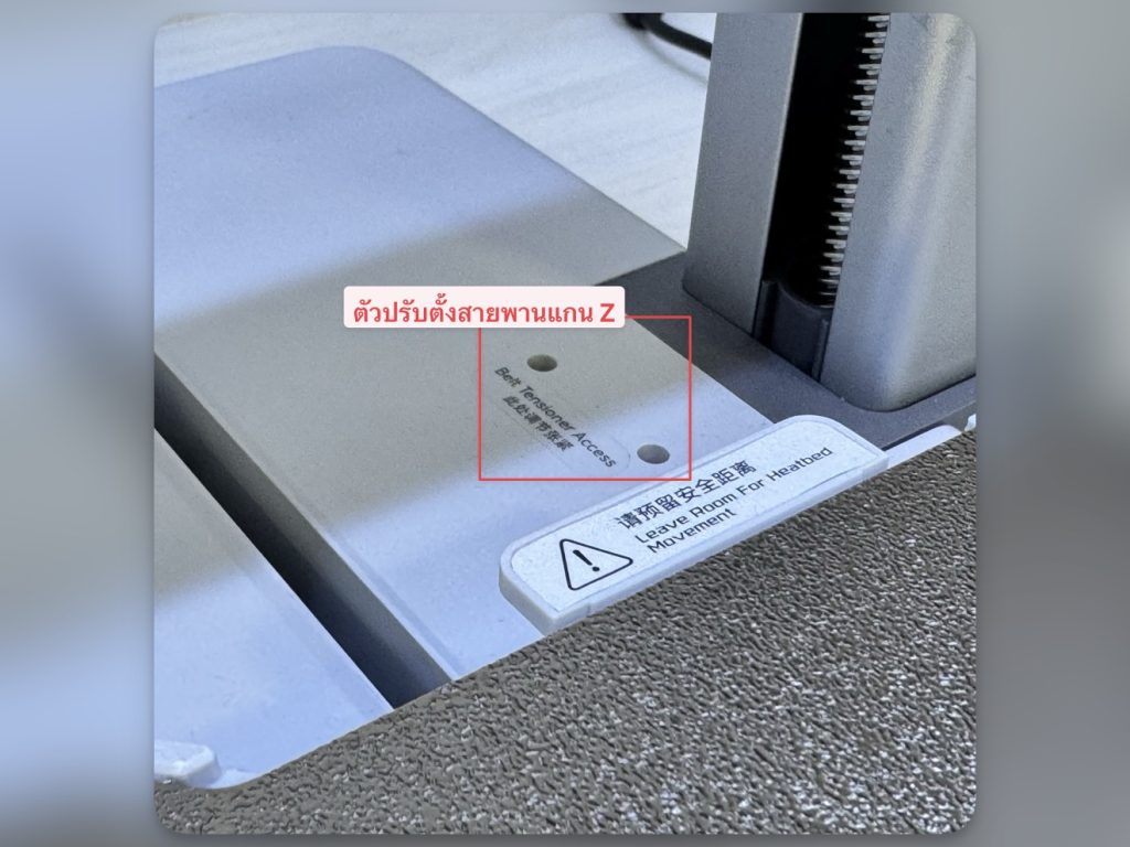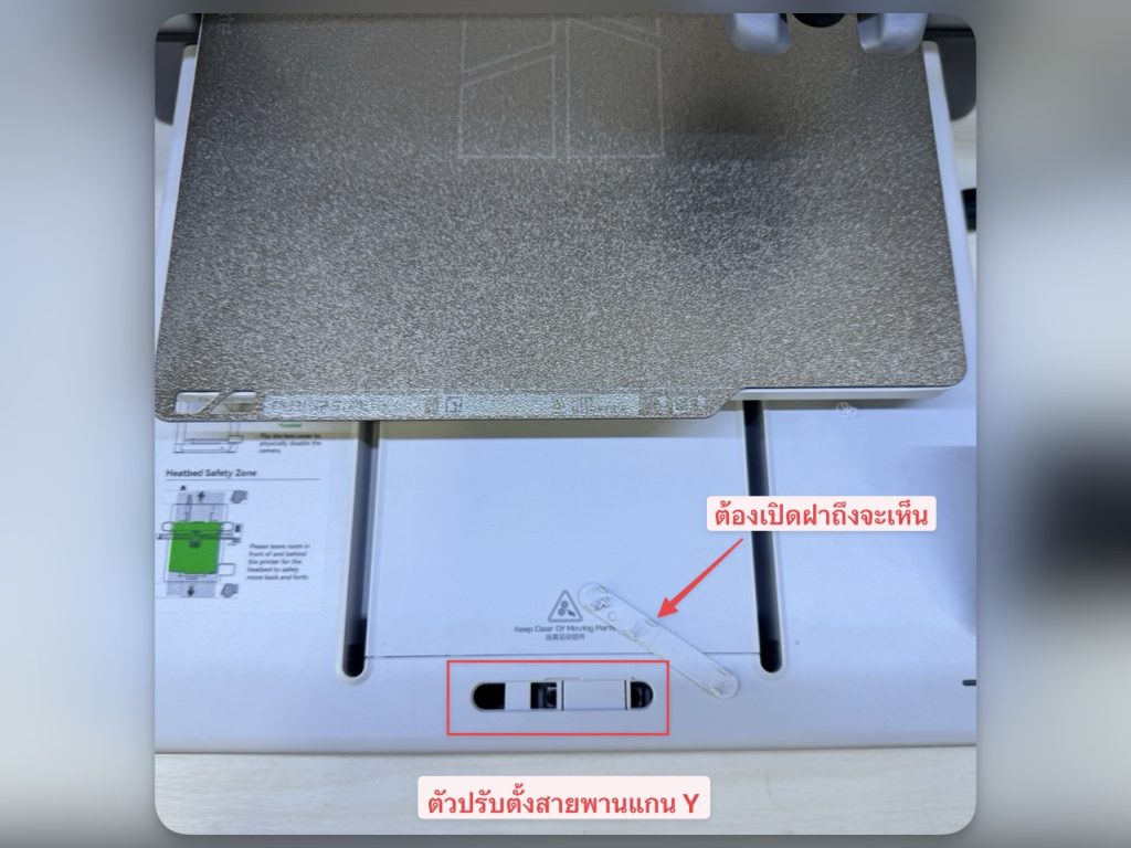 สำหรับแกน Y ตัวตั้งจะอยู่ตรงฐานปริ้น ต้องแกะฝาออกมาก่อน ถึงจะเห็นน็อตที่ใช้สำหรับปรับตั้งสายพาน ตัวเครื่อง A1 จะมีเซนเซอร์คอยวัดความตึงของสายพาน ถ้าสายพานเริ่มหย่อน หรือไม่ได้ค่าในเกณฑ์ ตัวเครื่องก็จะฟ้อง ขึ้นมาที่หน้าจอ