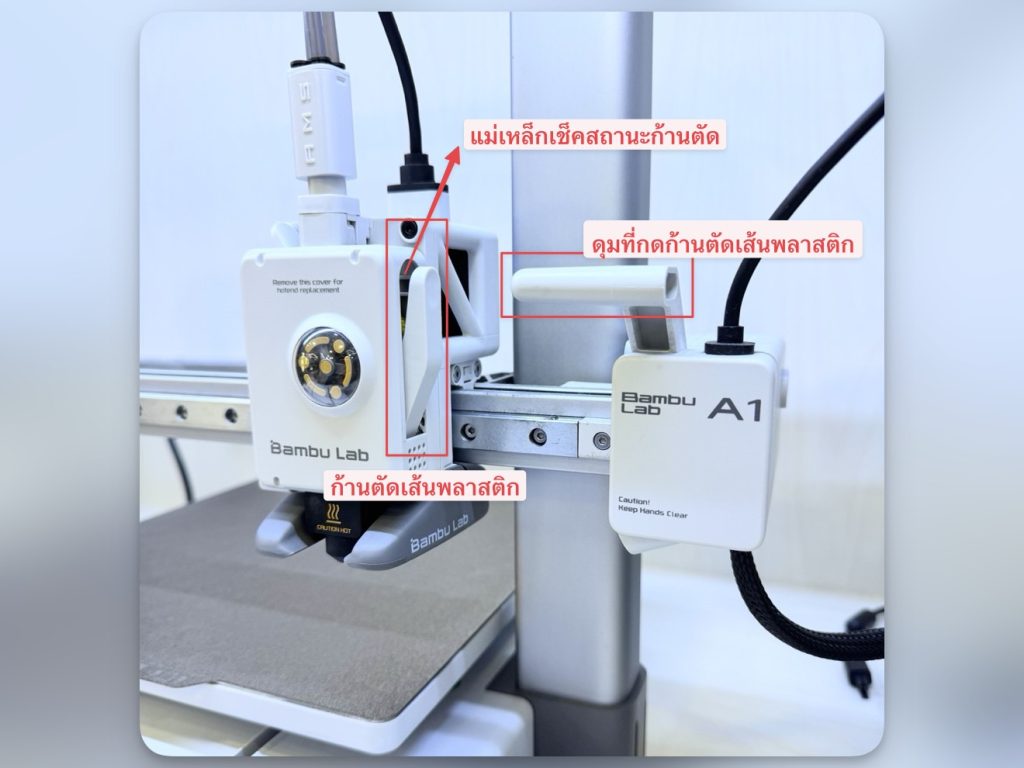 ตัวตัดเส้นพลาสติก มีหน้าที่ ตัดเส้น Filament ก่อนที่จะ Unload เส้นออก ซึ่งเวลาทำงาน ตัวชุดหัวฉีดจะวิ่งไปทางด้านขวาสุดของเครื่อง เพื่อที่ให้ก้านกดไปชนกับดุมพลาสติก เพื่อกดก้าน ที่มีใบมีด Cutter เพื่อตัดเส้นพลาสติกที่อยู่ในหัวฉีด ตัวก้านพลาสติกจะมีแม่เหล็ก สำหรับให้เซนเซอร์ที่อยู่ในชุดหัวฉีดอ่านว่า ตัวก้านตัดพลาสติก ทำงานอยู่ หรือค้าง ถ้าค้างไม่ยอมดีดกลับ เครื่องก็จะฟ้อง Error แล้วแจ้งผู้ใช้ให้ทำการแก้ไข