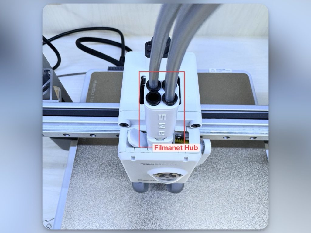 สำหรับ Filament Hub จะมีหน้าที่สำหรับรวมและแยกเส้นพลาสติก ถ้าใช้คู่กับ AMS Lite ก็จะช่วยให้เครื่องสามารถปริ้นหลายสีได้ ปริ้นได้มากสุด 4 สี ภายใน Filament Hub ก็จะมีเซนเซอร์ต่างๆ ที่คอยเช็คเส้นพลาสติก สามารถรู้ได้ว่า เส้นติด เส้นพันกัน หรือเส้นไม่ยอดไหลลงมา ตัวเครื่องก็จะหยุด และแจ้งเตือนผู้ใช้งานให้ทำการแก้ไข