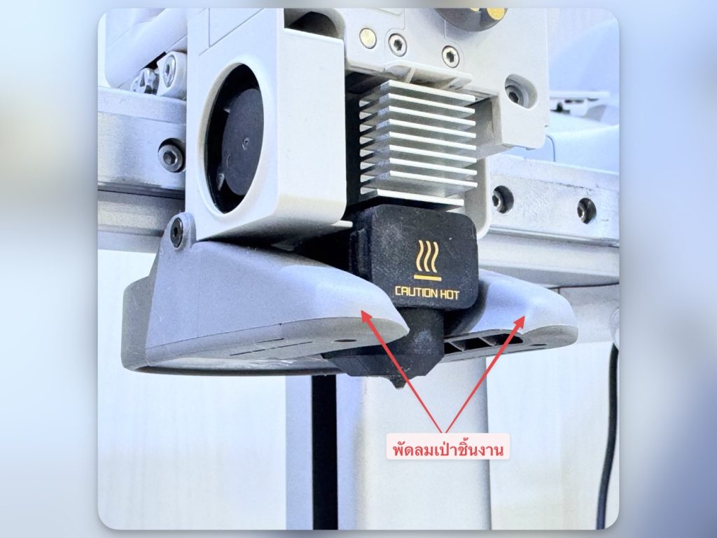 พัดลมเป่างาน เป็นอีกอุปกรณ์สำคัญ ที่ช่วยให้งานปริ้นออกมาสวย ซึ่งตัวพัดลม จะทำงานแบบอัตโนมัติ ความแรงของพัดลมจะปรับ แรง เบา ตามรูปร่างโมเดลที่กำลังปริ้นอยู่ ในบางกรณี พัดลมอาจจะปิด หรือไม่ทำงาน ถ้าปริ้นเส้นพลาสติกวิศวกรรม