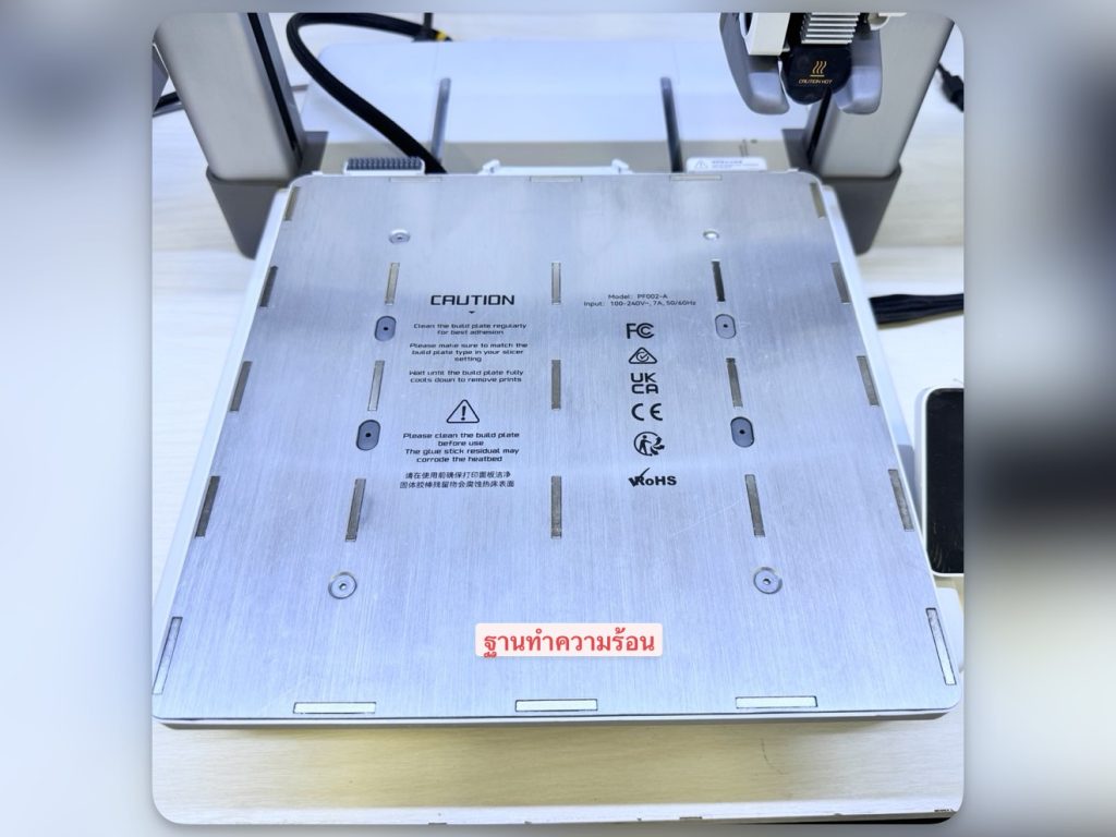 เครื่อง A1 จะมีฐานทำความร้อน ที่สามารถทำความร้อนได้สูงสุด 100 องศา การที่มีฐานทำความร้อน จะช่วยให้พลาสติก ติดแน่นที่ฐานระหว่างปริ้น ไม่หลุดออก ซึ่งความร้อนที่ฐาน จะแตกต่างกันไป ตามชนิดพลาสติกหรือ Filament ที่เลือกในโปรแกรม Bambu Studio นอกจากช่วยให้งานติดฐานแล้ว ยังช่วยลดการหลุดหรือหดตัวของพลาสติกบางชนิด