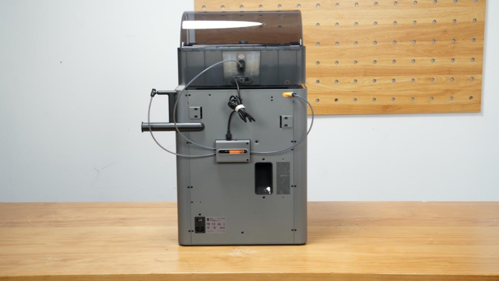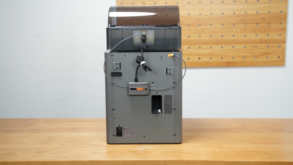 วาง AMS 2 Pro ไว้บนเครื่องพิมพ์ จากนั้นเชื่อมต่อสาย Bambu Bus (6-pin) และท่อ PTFE เข้ากับด้านหลังของเครื่องพิมพ์