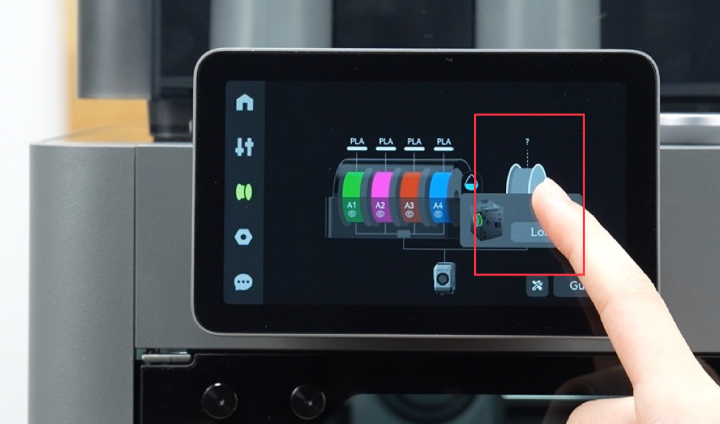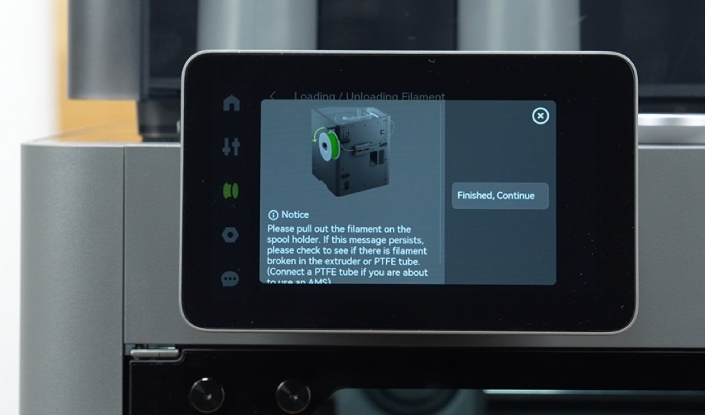 ข้อควรรู้: การโหลดเส้นจากตัวแขวนเส้นด้านนอก จำเป็นที่จะต้องกดโหลดเส้นเอง โดยที่ต้องโหลดจนกว่า เส้นพลาสติกจะไหลออกมาจากหัวฉีด ซึ่งจะต่างจากเครื่องที่มีกล่อง AMS ที่ไม่จำเป็นต้องกดโหลด นอกจากนั้น เส้นที่ใส่ไว้ที่ตัวแขวนเส้น ไม่ว่าจะยี่ห้ออะไร ผู้ใช้จะต้องไปบอกที่ตัวเครื่อง ว่าเส้นที่แขวนด้านนอก เป็นเส้นอะไร ชนิดอะไร และสีอะไร ผ่านหน้าจอ หรือ App Bambu Handy