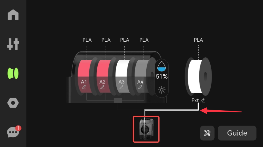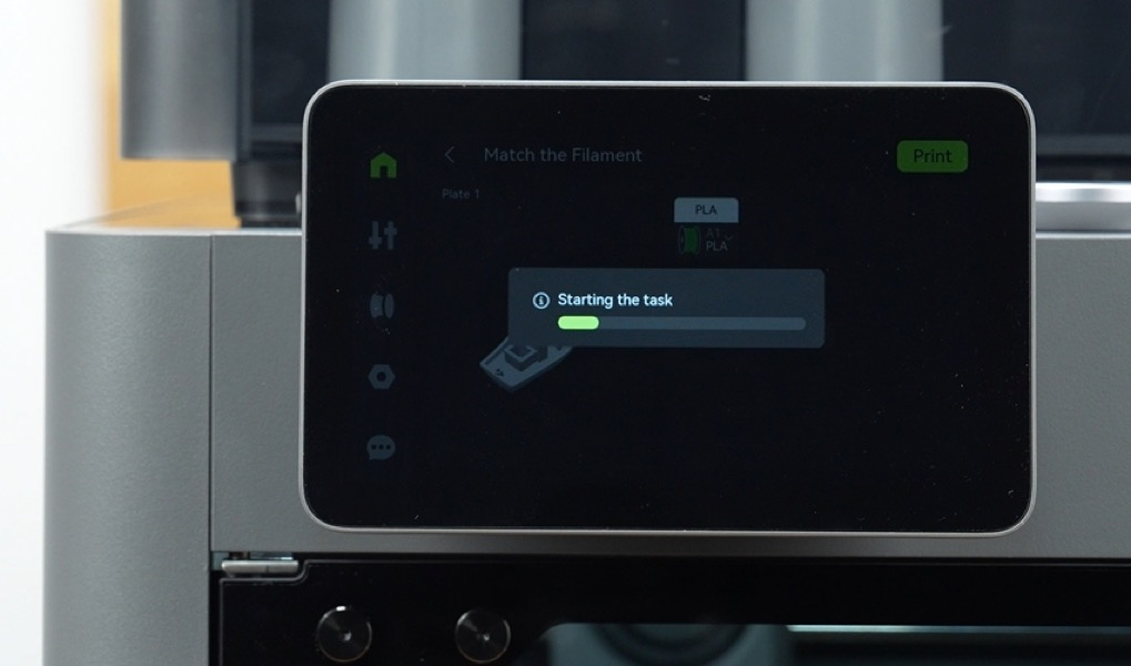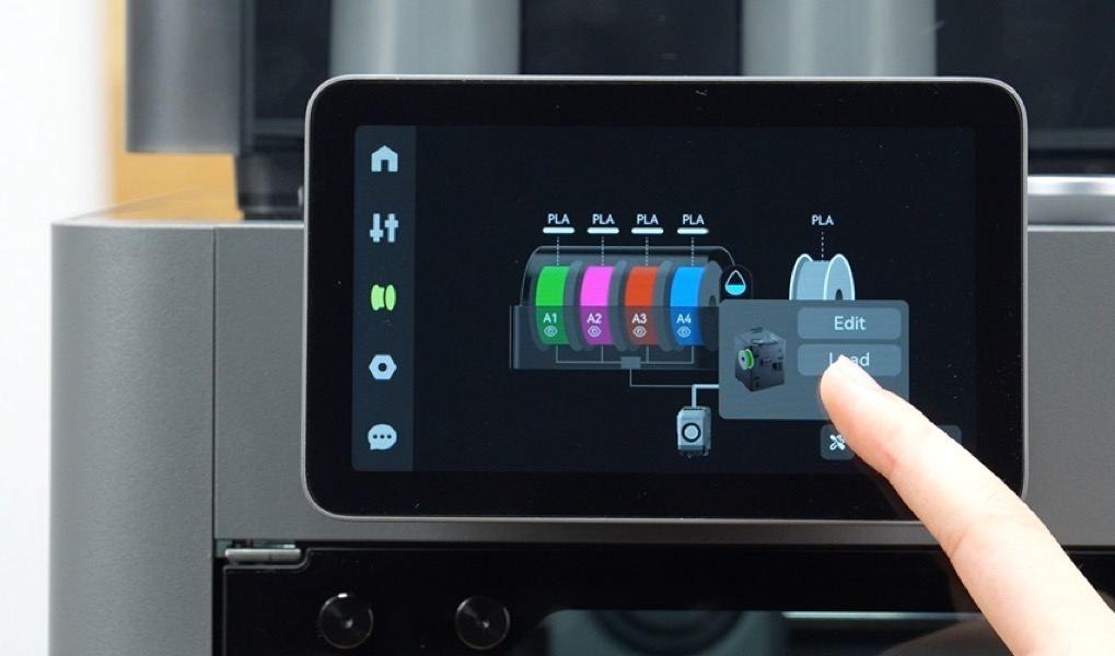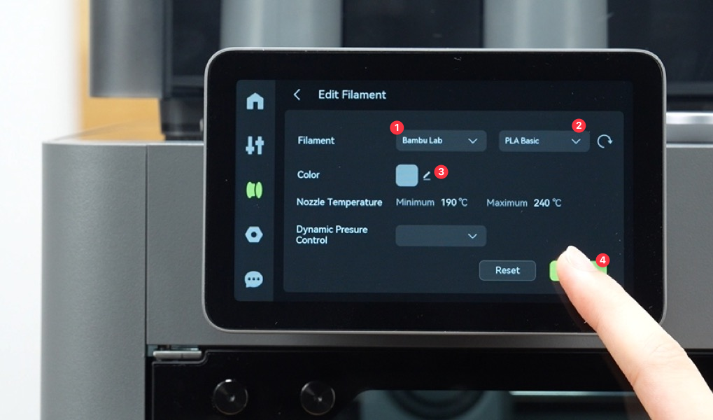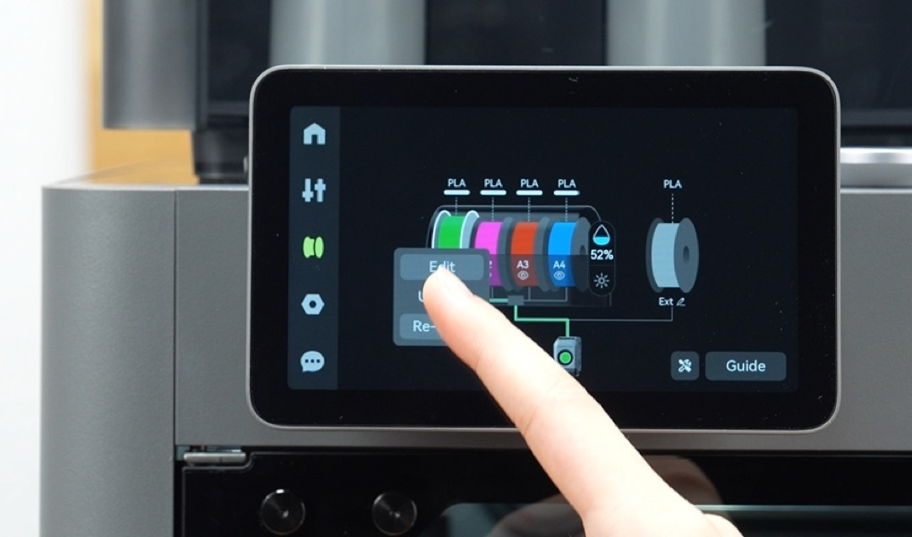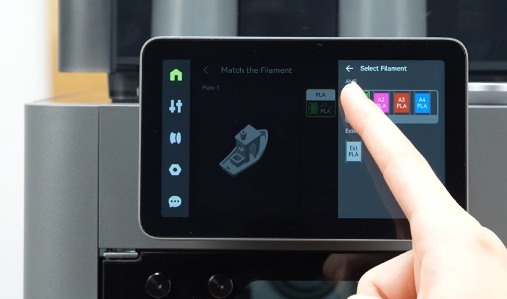 กรณีที่ใช้เส้นพลาสติกยี่ห้อ Bambu Lab ตัวเครื่องจะทำการตรวจเช็ค และตั้งค่าเส้นให้แบบอัตโนมัติ โดยการอ่านป้าย NFC ที่ติดอยู่ที่ม้วนเส้น แต่ถ้าเป็นยี่ห้ออื่น ผู้ใช้จะต้องทำการบอกเครื่อง ว่าเส้นที่ใส่ เป็นเส้นยี่ห้ออะไร เส้นชนิดไหน รวมถึงสีของเส้น