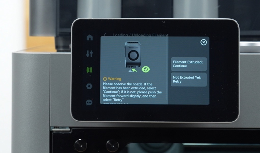 สังเกตที่หัวฉีด หากพลาสติกเริ่มไหลออกมา ให้กด ‘Filament extruded, continue’ แต่ถ้ายังไม่เห็นเส้นไหลออกมา ให้กด ‘Filament not extruded, retry‘ แล้วใช้มือดันเส้นพลาสติกอีกครั้ง