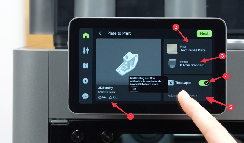 ขั้นตอนนี้สามารถทำได้ผ่านหน้าจอสัมผัส, Bambu Studio หรือ Bambu Handy คำแนะนำด้านล่างแสดงการใช้งานผ่านหน้าจอสัมผัส ซึ่งจะใช้ไฟล์ตัวอย่างทีมากับเครื่อง แนะนำให้ปริ้นไฟล์เรือ Benchy ซึ่งเส้นที่จะใช้ปริ้นต้องเป็นเส้น PLA เท่านั้น ยี่ห้อไหนก็ได้