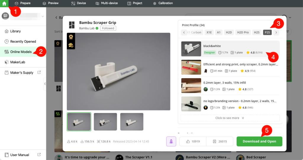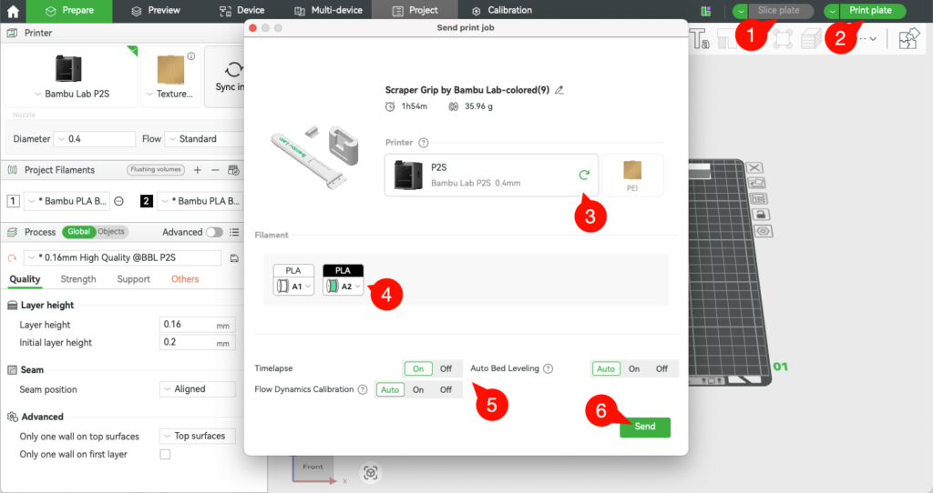 เชื่อมต่อ Wi-Fi และคอมพิวเตอร์เข้ากับเครื่องพิมพ์ เลือกโมเดลในโปรแกรม ปรับ Print Profile แล้วคลิก ‘Download and Open’ จากนั้นคลิก ‘Slice Plate’ แล้ว ‘Print Plate’ ยืนยันรุ่นเครื่องพิมพ์และเส้นพลาสติก แล้วคลิก ‘Send’ เพื่อส่งไฟล์ไปยังเครื่องพิมพ์