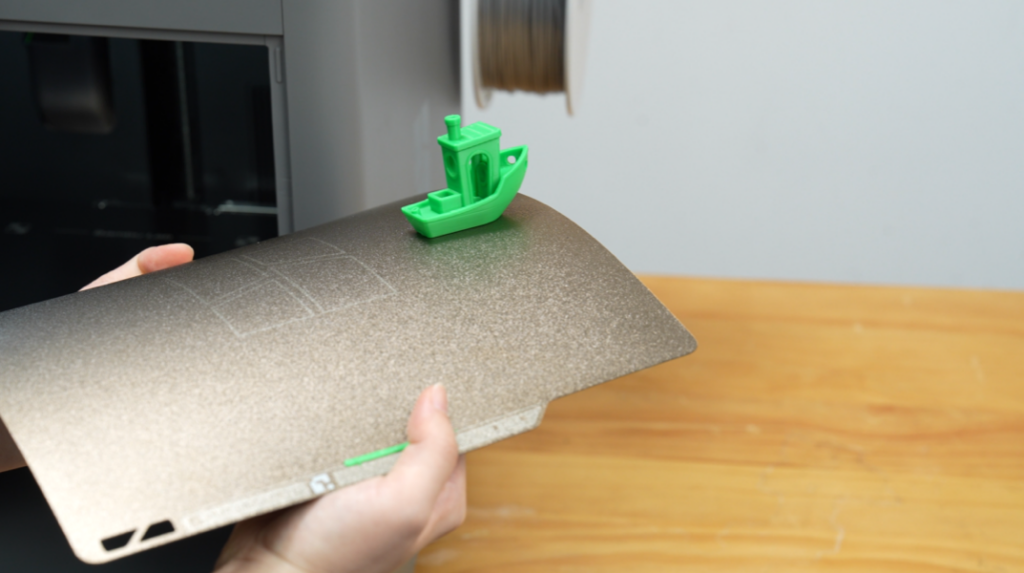 หลังจากพิมพ์เสร็จ แนะนำให้รอฐานพิมพ์และโมเดลเย็นลงถึงอุณหภูมิห้อง จากนั้นนำฐานพิมพ์ออกแล้วค่อยๆ บิดและงอแผ่นฐานพิมพ์เพื่อปลดงานที่ปริ้นออก ถ้าจะให้งานออกง่าย แนะนำให้บิดฐานงอ ขึ้นและลง สำหรับงานที่ความบาง การบิดและงอแผ่น อาจจะไม่สามารถเอางานออกได้ เพราะงานที่บาง จะงอไปตามแผ่น ถ้าเป็นแบบนี้ จะต้องใช้ใบมีดแซะเอางานออก