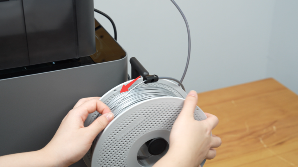 วางม้วนพลาสติกบนแกนยึดตามทิศทางการหมุนของเส้นพลาสติก สังเกตประเภทและสีของเส้นพลาสติกก่อนโหลด