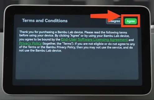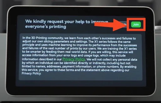เมื่อเพิ่มเครื่องเรียบร้อย จะมีข้อตกลง ในการใช้งานเครื่อง ให้กดปุ่ม Agree เพื่อทำการยอมรับ สำหรับหน้าต่างถัดไปจะเป็นการขอเข้าร่วมการแชร์ข้อมูลในเรื่องของการใช้งาน เพื่อให้ทาง Bambu Lab สามารถที่จะเอาไปพัฒนาและแก้ไขได้ ซึ่งหน้าต่างนี้ สามารถที่จะ Join เพื่อเข้าร่วม หรือกด Skip เพื่อข้าม