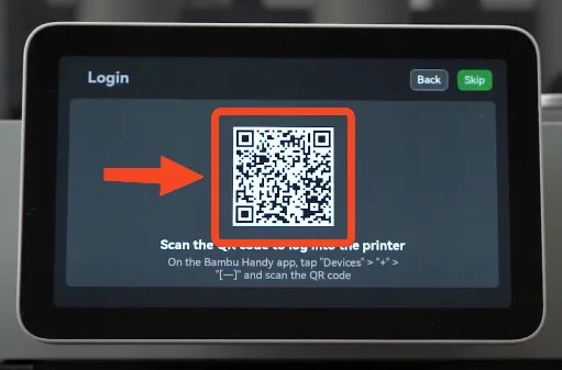 หน้าต่างถัดไปจะมี QR code แสดงขึ้นมา ให้เอามือถือที่ลง App Bambu Handy มาทำการสแกน เพื่อผูกตัวเครื่องเข้ากับบัญชีที่สร้างไว้ก่อนหน้า ใน App Bambu Handy ถ้ายังไม่ทำให้ทำการลงทะเบียนสร้าง Account ก่อน