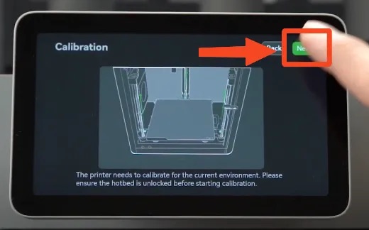 ก่อนที่จะกดปุ่ม Calibrate จะมีหน้าต่างแสดงขึ้นมา เตือนว่า ให้ถอดน็อตยึดฐาน 3 ตัวออกก่อน ซึ่งตรงนี้ถ้าใครถอดตั้งแต่แรก ก็ให้กด Next ได้เลย แต่ถ้ายังไม่ถอด ก็ให้ถอดน็อตออกก่อน เพราะถ้าไม่ถอด ตัวฐานจะขยับขึ้นด้านบนไม่ได้