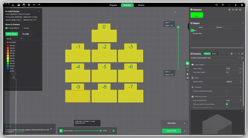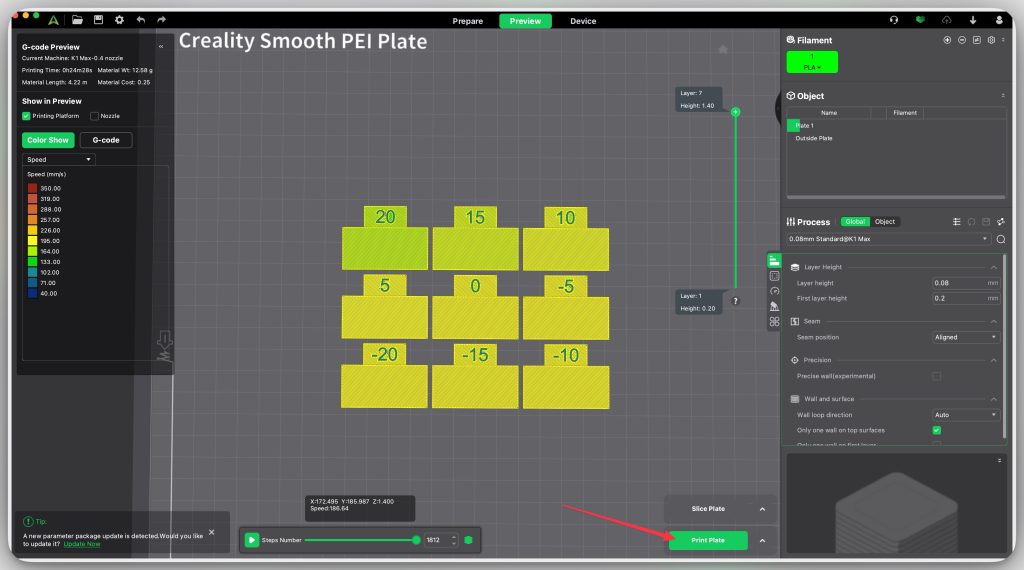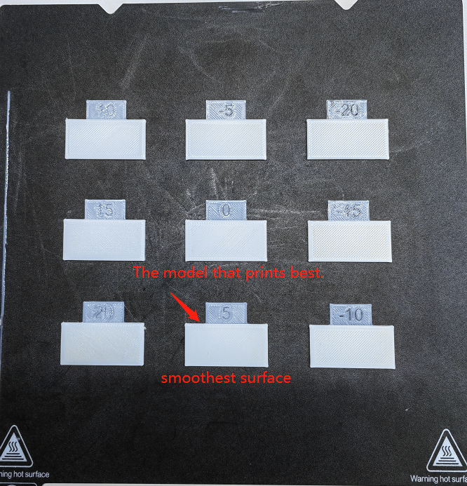 ตัวโปรแกรมจะทำการสร้างไฟล์สำหรับเทส Flow rate ออกมาให้อีกชุด เป็นโมเดลรูปสีเหลี่ยมจำนวน 9 รูปเหมือนกัน แต่ครั้งนี้จะเป็นค่าติดลบ และมีช่วงที่ละเอียด อยู่ระหว่าง 0 – 9% โดยแต่ละช่วงจะห่างกัน 1% โมเดลแต่ละรูปจะมีตัวเลขกำกับเหมือนเดิม สำหรับไว้บอกค่าของ Flow rate ของโมเดลชิ้นนั้น ซึ่งหลักการเลือกก็เหมือนกับครั้งแรก คือโมเดลชิ้นไหน ที่ปริ้นออกมาแล้วดูสวยที่สุด ก็แปลว่า ก็ให้ใช้ค่า Flow rate ตัวนั้น มาคำนวนกับค่าที่ได้ในขั้นตอนแรก