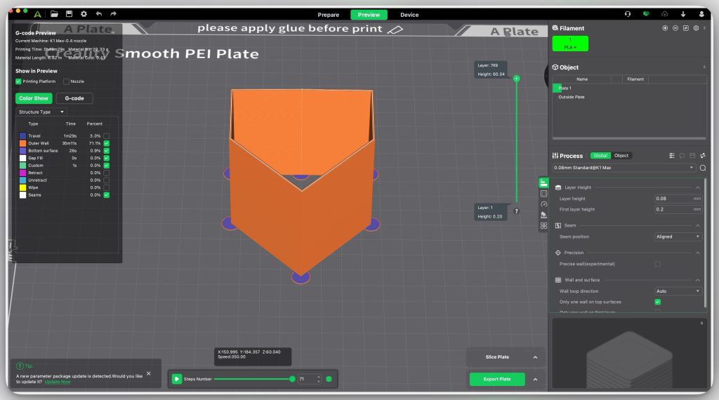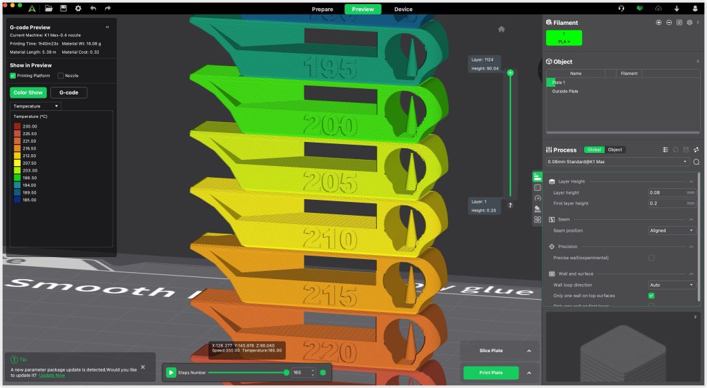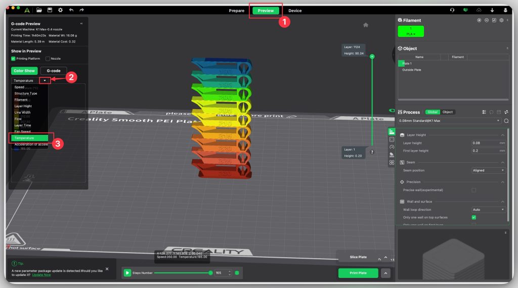 หลักจากกดปุ่ม OK ตัวโปรแกรมก็จะสร้างโมเดลที่เรียกว่า Temp Tower Calibration ให้ ซึ่งสามารถดูทางเดินหัวพิมพ์ได้ที่หน้า Preview รวมไปถึงดูช่วงความร้อนของการฉีดพลาสติกออกมาได้ โดยต้องเปลี่ยน Color Show ที่กล่องด้านซ้ายให้เป็น Temperature
