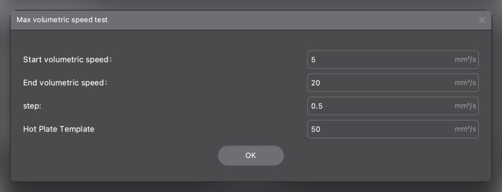 สูตรที่ใช้ในการคำนวน ให้เริ่มจากเอาค่า Start Volumetric speed + (ค่าที่วัดได้จากไม้บรรทัดมีหน่วยเป็นมิล x Step ช่วงความเร็วที่จะให้เพิ่มขึ้น) ตัวอย่างจากภาพจะแทนสูตรได้ 5 + (20 x 0.5) = 15