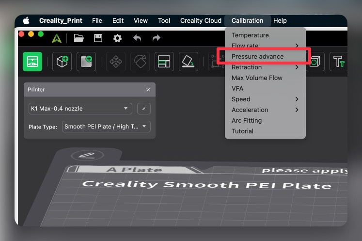 เลือกคำสั่ง Pressure Advance ในเมนู Calibration