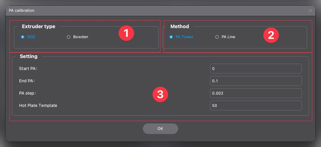 สำหรับค่านี้ รูัจักกันในชื่อว่า Pressure Advance ซึ่งจะเป็นค่าที่จะช่วยหาความสัมพันธ์เร่ง ในนการเคลื่อนที่ของหัวพิมพ์ กับอัตราการฉีดของเส้นพลาสติกที่ฉีดออกมาจากหัว ให้สัมพันธ์กัน เมื่อก่อนไม่มีค่านี้ ชิ้นงานที่มีส่วนโค้ง ส่วนเว้า ก็จะมีเส้นล้น เส้นเกินออกมา ทำให้บางที งานที่ปริ้นเสร็จไม่สามารถนำไปสวมประกอบกันได้ เพราะส่วนโค้งที่ใหญ่กว่างานที่เขียน ซึ่งค่านี้จะช่วยให้โปรแกรมคำนวนว่า ควรจะหยุดจ่ายเส้นพลาสติก ช่วงเวลาไหน ต้องไม่ลืมว่า ตัวเส้นพลาสติกที่ถูกฉีด จะมีแรงดันและแรงเฉื่อยอยู่ ต่อให้มอเตอร์หยุดดันเส้น ตัวเส้นก็ยังจะสามารถไหลออกมาจากหัวฉีดได้