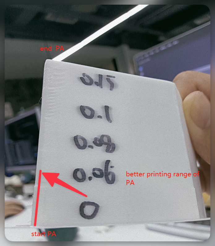 การหาค่านี้ ก็จะใช้การพิมพ์โมเดลเทสขึ้นมา โดยเป็นโมเดลที่มีมุมแหลม หรือมุมหักศอก เพื่อที่จะเครื่องจะได้ลดและเร่งความเร็ว สำหรับการวัดค่า จะวัดจากความสูงด้านล่างสุด จนไปถึงจุดที่ ส่วนโค้งที่พิมพ์ออกมาดูสวยสุด คมและแหลมที่สุด ไม่ย้วยหรือมีเส้นล้น ก็จะเอาความสูงทีวัดได้ในจุดนั้น มาคำนวนเป็นค่า Pressue Advance แล้วนำไปใส่ในโปรแกรม