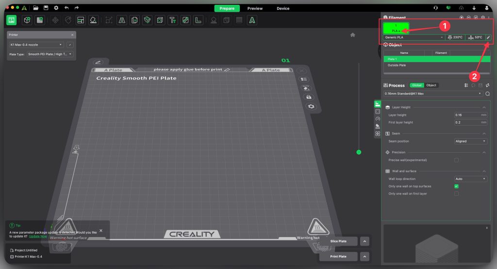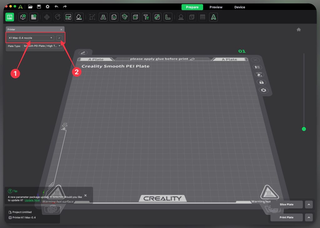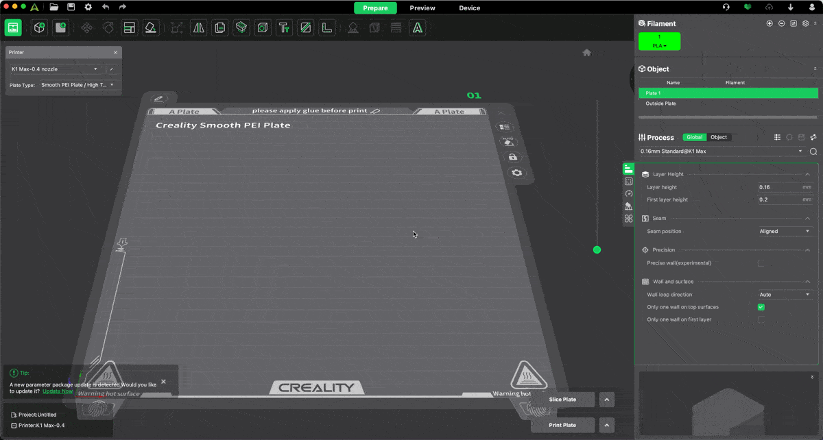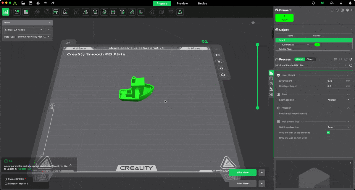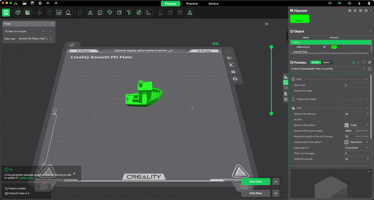 สำหรับโปรแกรม Creality Print V5 จะเน้นใช้กับเครื่อง Creality ทุกรุ่น และทางบริษัทเอง จะมีทีมงานเฉพาะกิจที่คอยปรับแต่งค่า Preset ของเครื่องแต่ละรุ่น อยู่ตลอดเวลา เพื่อให้งานปริ้นออกมา ดีที่สุด สวยที่สุด เมื่อได้ค่าที่ดีที่สุดแล้ว ก็จะปล่อยให้โปรแกรม Download ค่านั้นไปใช้ ซึ่งตัวโปรแกรมจำเป็นต้อง ต่อกับ Internet ด้วย ถึงจะมีการแจ้งเตือนว่า มี Preset ใหม่ออกมาให้ Update ซึ่งกล่องแจ้งเตือนจะอยู่มุมขวาด้านล่าง