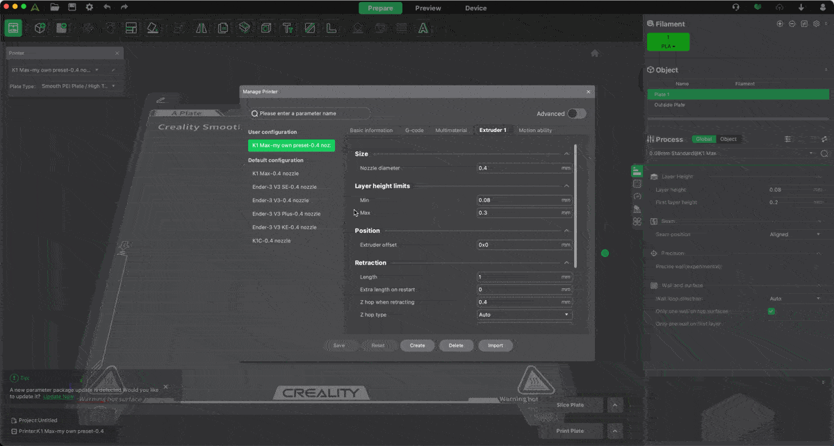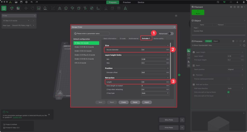 ค่าที่เปลี่ยนมากสุดของ Printer Preset จะเป็นเรื่องของขนาดรูหัวฉีด ไม่ก็ระยะในการดึงเส้นพลาสติกกลับหรือ Retraction ซึ่งเครื่อง Creality ทุกรุ่น หัวฉีดมาตรฐานจะเป็น 0.4 มิลลิเมตร แต่สามารถที่จะเปลี่ยนขนาดได้ โดยการซื้อหัวฉีดมาเปลี่ยน ยิ่งรูใหญ่ เส้นที่ฉีดออกมาก็จะยิ่งหนา ทำให้การเชื่อมต่อกันระหว่างชั้น จะแน่นขึ้น งานก็แข็งแรงมากขึ้น ในทางกลับกัน ทางรูหัวฉีดเล็ก ก็จะเก็บรายละเอียดงานได้ดีขึ้น แต่ก็จะใช้เวลาพิมพ์งานนานมากขึ้น