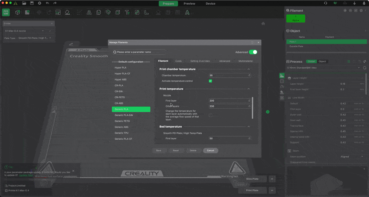 สำหรับผู้ใช้มือโปร สามารถที่จะสร้าง Preset เอาไว้ใช้เองได้ โดยการทำ Calibration เพื่อหาค่าต่างๆ แล้วบันทึกเก็บไว้ในโปรแกรม Creality Print สำหรับ Preset ที่สามารถสร้างได้จะแบ่งออกเป็น 3 ประเภทด้วยกัน ได้แก่