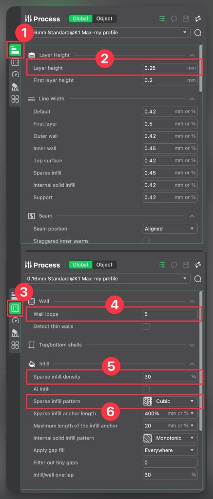 การตั้งชื่อ Preset แนะนำ ตั้งให้สอดคล้องกับค่าที่เปลี่ยน เพื่อที่จะได้จำได้ว่ามีการเปลี่ยนอะไรไปบ้าง เช่น K1_MAX_0.25_INFILL_20_Gyroid หมายความว่า เป็น Profile สำหรับเครื่องรุ่น K1 Max ใช้ความละเอียด 0.25 มิลในการพิมพ์ ใส่ Infill ปริมาณ 20% ในรูปแบบ ของ Gyroid