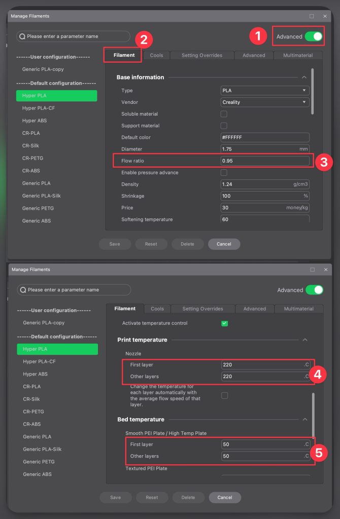 ในหน้าต่างของการตั้งค่าเส้น ก็จะมีแบ่งเป็นแทบ ซึ่งค่าในตอนแรกที่ปรับจะมีมาไม่ครบ ให้เปิดปุ่ม Advance เพื่อให้โปรแกรมแสดงค่าทั้งหมด ออกมา ส่วนใหญ่การตั้งค่าเส้นพลาสติก จะปรับความร้อนหัวฉีดและฐานพิมพ์ รวมไปถึงค่าอัตราการไหลของเส้นพลาสติกหรือ Flow Ratio