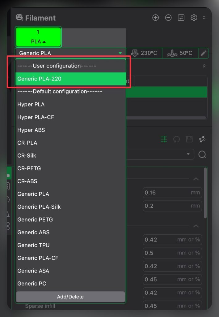 เมื่อสร้างเสร็จแล้ว ตัว Preset ตัวนี้จะถูกเก็บไว้ในโปรแกรม สามารถเรียกกลับมาใช้ได้ตลอด ซึ่งการเลือก Preset ก็สามารถเลือกจากแทบหน้าต่าง Filament ได้เลย ตัว Preset จะที่สร้างเอง จะถูกแบ่งเอาไว้ ไม่ไปรวมกับ Preset ที่โปรแกรมสร้างขึ้น