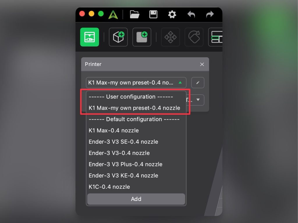 เป็นการกำหนดคุณสมบัติของเครื่อง เช่น ขนาดพื้นที่การพิมพ์ , อุปกรณ์เสริมที่ติดมาในเครื่อง, รูหัวฉีดที่ใส่อยู่ในเครื่อง ซึ่งส่วนใหญ่จะเป็นค่าเริ่มต้น ที่ต้องเอามาไว้คำนวน เพื่อสร้างไฟล์ สำหรับปริ้น ส่วนใหญ่ใน Printer Preset จะใช้เปลี่ยนค่า Retraction สำหรับการดึงเส้นพลาสติกกลับเข้าไปในหัวฉีด กับการเปลี่ยนขนาดรูของหัวฉีด