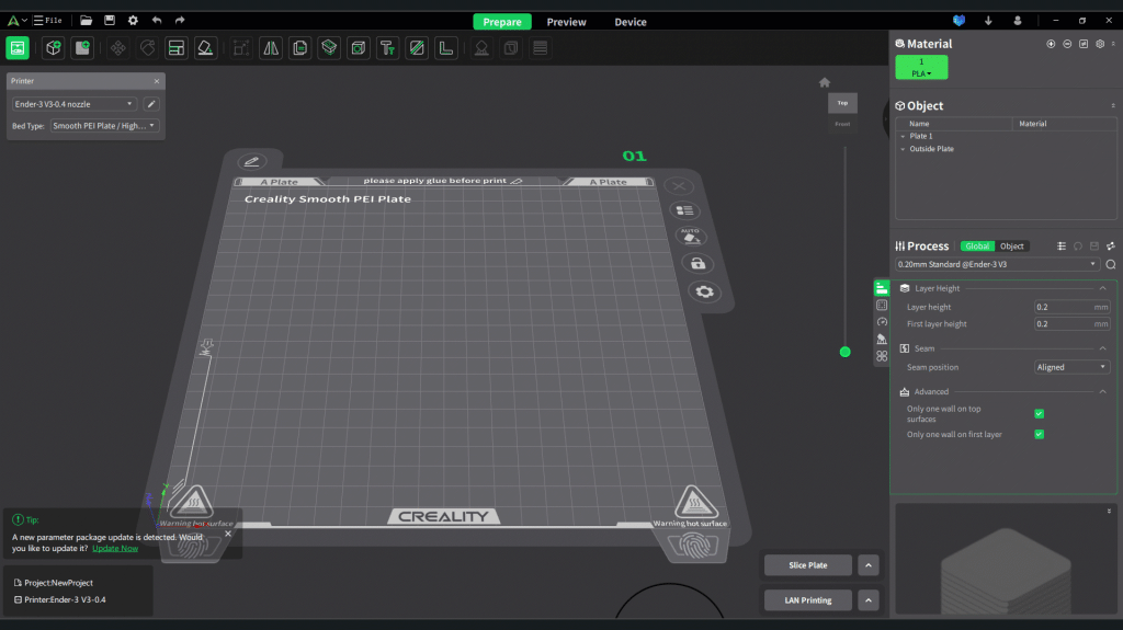 สำหรับโปรแกรม Creality Print V5 จะเน้นใช้กับเครื่อง Creality ทุกรุ่น และทางบริษัทเอง จะมีทีมงานเฉพาะกิจที่คอยปรับแต่งค่า Preset ของเครื่องแต่ละรุ่น อยู่ตลอดเวลา เพื่อให้งานปริ้นออกมา ดีที่สุด สวยที่สุด เมื่อได้ค่าที่ดีที่สุดแล้ว ก็จะปล่อยให้โปรแกรม Download ค่านั้นไปใช้ ซึ่งตัวโปรแกรมจำเป็นต้อง ต่อกับ Internet ด้วย ถึงจะมีการแจ้งเตือนว่า มี Preset ใหม่ออกมาให้ Update ซึ่งกล่องแจ้งเตือนจะอยู่มุมขวาด้านล่าง