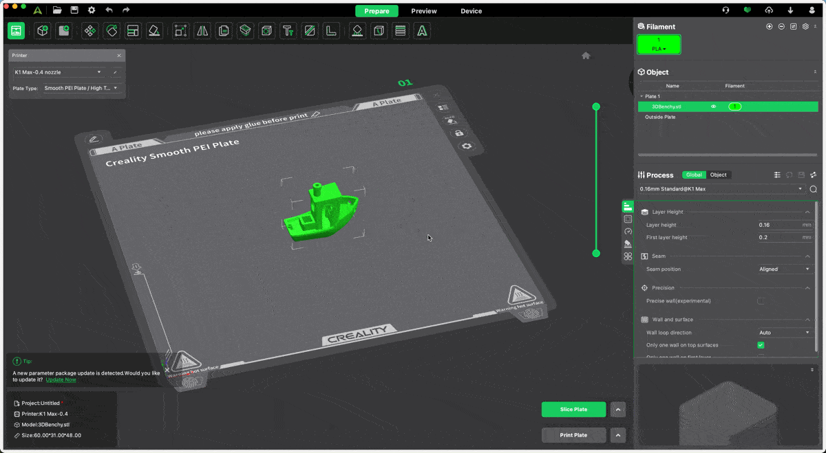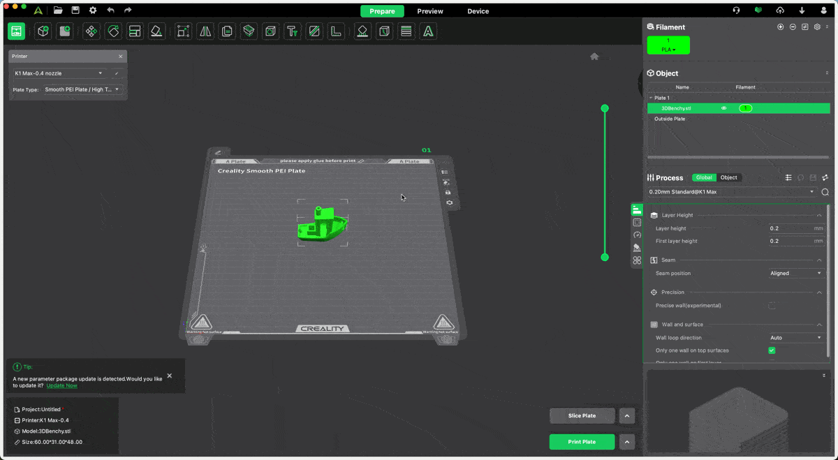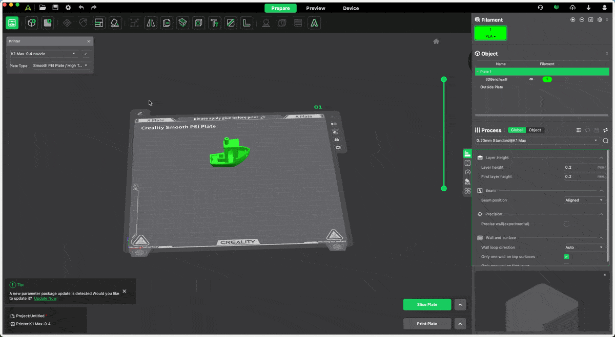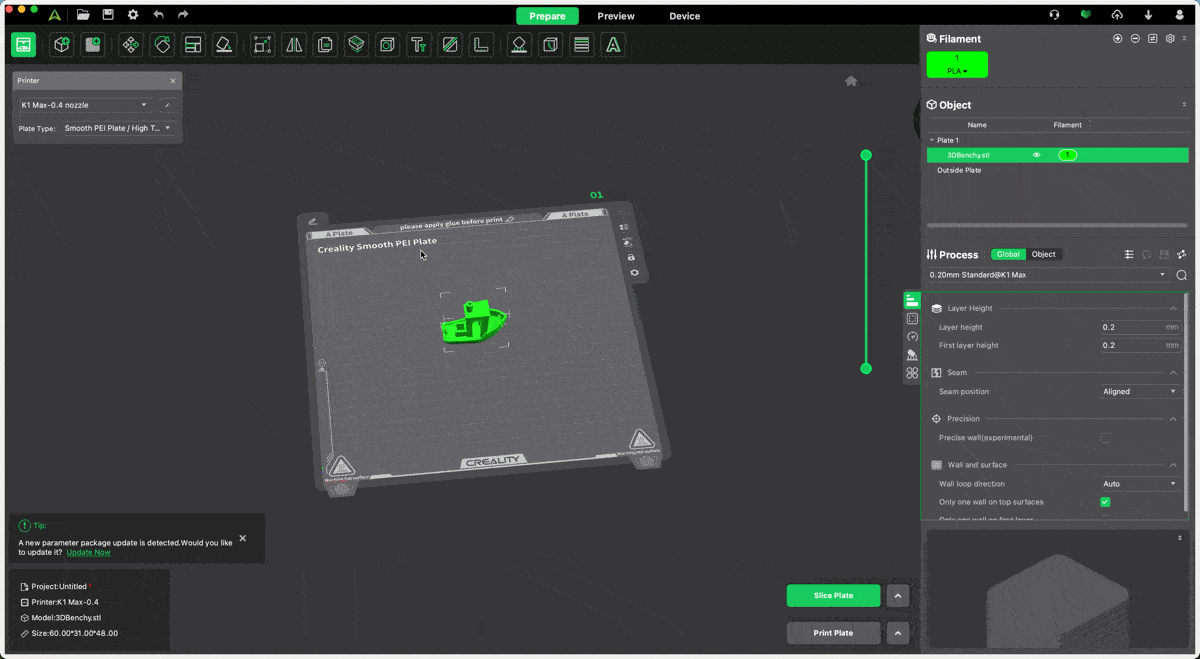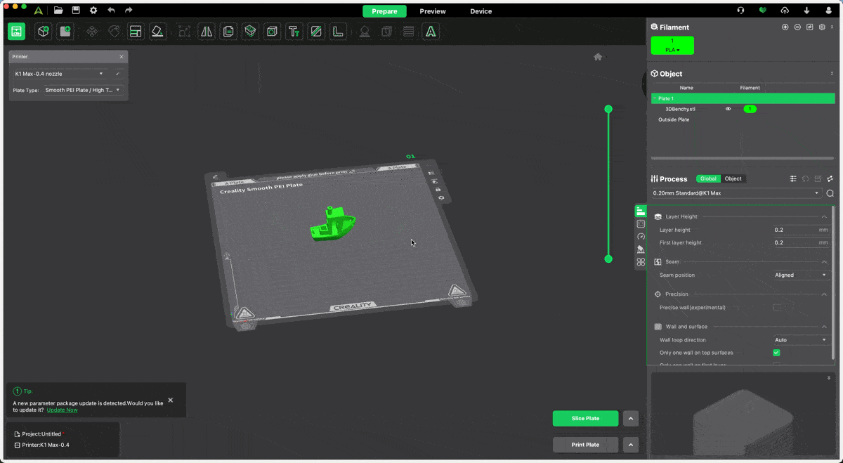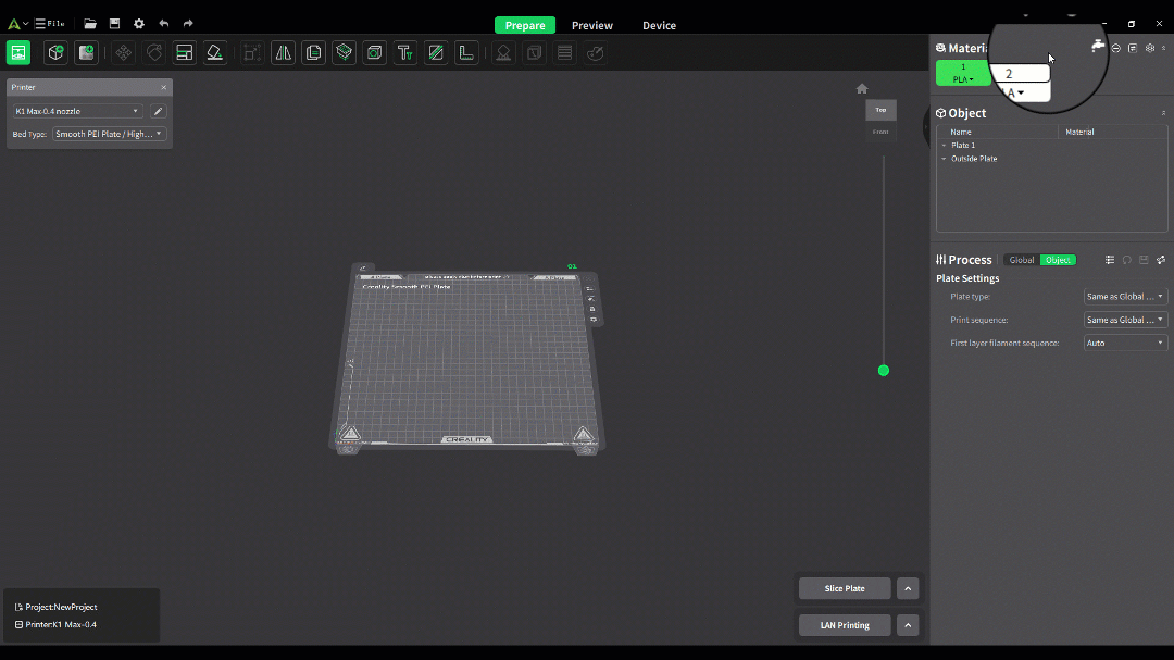 ตัวโปรแกรมรองรับการปริ้นโมเดล 3 มิติ หลายๆ ตัวพร้อมกัน ซึ่งบางครั้ง โมเดลแต่ละตัว อาจจะมีการตั้งค่าที่แตกต่างกัน หรือใช้เส้นต่างชนิด ตัวโปรแกรมเลยถูกออกแบบมาให้มี ฟีเจอร์ช่วยในการจัดการ และแบ่งเพลทการทำงาน ช่วยให้การจัดการทำได้ง่ายขึ้นและไม่สับสน