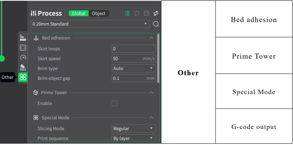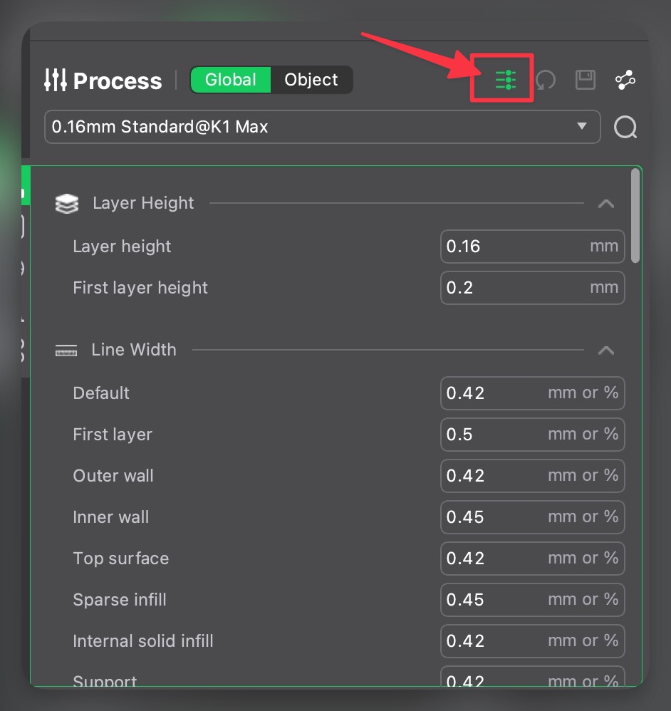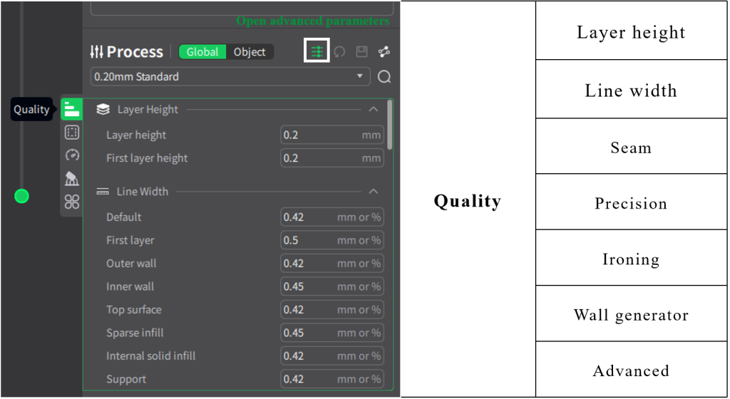 แทบนี้จะเป็นแทบที่มีรายละเอียดเยอะที่สุด เพราะเป็นแทบที่ใช้ในการกำหนดและตั้งค่าการพิมพ์ ซึ่งสามารถที่จะปรับแต่งให้เหมาะกับงานที่จะปริ้น สำหรับแทบนี้ จะรวมคำสั่งและค่าต่างๆ ที่เกี่ยวกับผิวงาน / ความแข็งแรง / ความเร็ว / การสร้าง Supoprt และตัวช่วยอื่นๆ