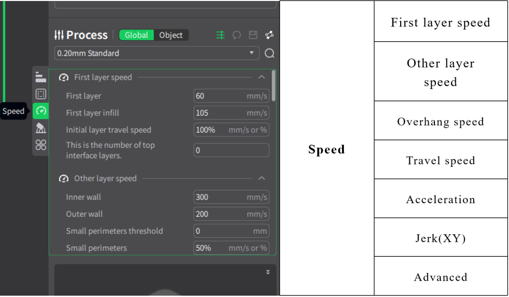 รวมค่าที่เกี่ยวของกับความเร็วในการปริ้น ซึ่งความเร็วในการปริ้นขึ้นอยู่กับปัจจัยหลายๆอย่าง ทั้งชนิดเส้นพลาสติกที่ใช้ / ความหนืดของเส้น / อัตราเร่ง / โครงสร้างเครื่อง ซึ่งถ้าปรับไม่ดี อาจจะทำให้มอเตอร์หลุด Step ชิ้นงานที่ปริ้นออกมาเหลื่อม ไม่ตรง สำหรับความเร็ว ก็จะถูกแบ่งออกเป็นส่วนๆ ส่วนที่มองเห็นได้ด้วยตา สัมผัสด้วยมือ ก็ควรจะพิมพ์ช้า กว่าส่วนอื่นๆ