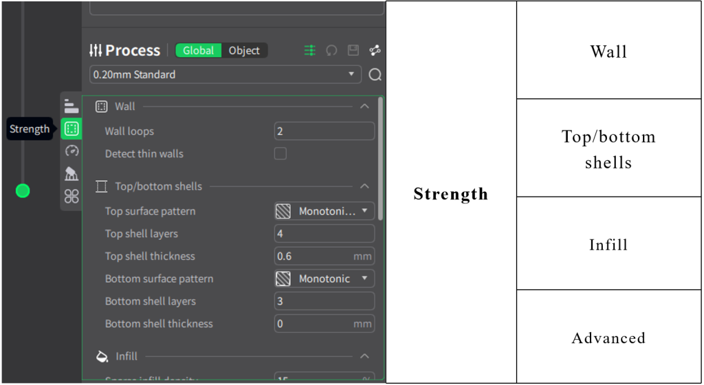 เป็นแทบการตั้งค่าที่เกี่ยวกับความแข็งแรงของชิ้นงาน ว่าอยากให้งานที่ปริ้นออกมาแข็งแรงแค่ไหน ซึ่งจะเกี่ยวกับโครงสร้างด้านใน และความหนาของผนัง ซึ่งถ้าอยากให้แข็งแรงมาก ก็จะใช้พลาสติกในการพิมพ์มาก เวลาที่ใช้ปริ้นก็จะนานขึ้น ในแทบนี้ ก็จะมีหัวข้อย่อยในการตั้งค่าดังนี้