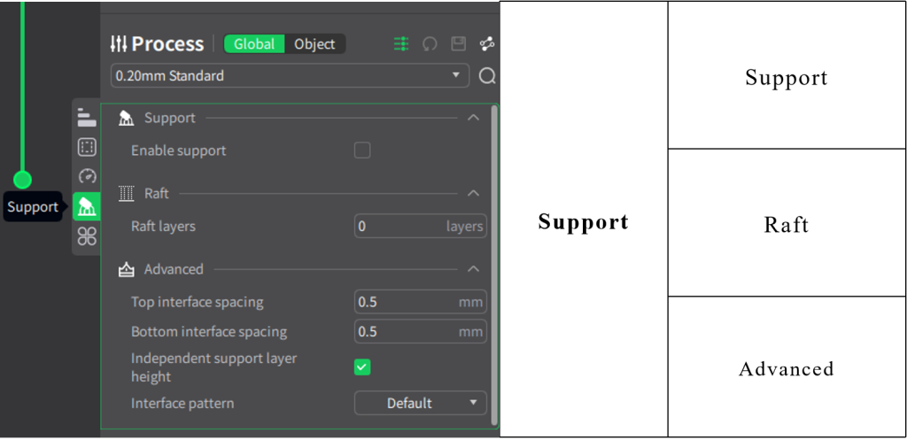 Support หรือตัวรองรับ เป็นสิ่งสำคัญสำหรับการปริ้น 3 มิติ เพราะโมเดล 3 มิติบางตัว อาจจะมีส่วนยื่น หรือส่วนเกิน ที่ลอยกลางอากาศ ที่ไม่สามารถปริ้นได้ ถ้าไม่มี Support แต่การที่มี Support ก็จะทำให้งานปริ้น ปริ้นได้ช้า และยังใช้เส้นพลาสติกที่มากขึ้น ซึ่งการตั้งค่า Support สามารถที่จะมาช่วยลดสิ่งเหล่านี้ลงได้ แต่การเปลี่ยนค่า ตรงนี้ จะต้องใช้ประสบการณ์พอสมควร เพราะถ้าปรับ ลดมากเกินไป ก็อาจจะทำให้งานที่ปริ้น เสียได้ ซึ่งจะต้องมาเสียเวลาปริ้นขึ้นมาใหม่ และยังจะต้องเสียพลาสติกไปอีกด้วย