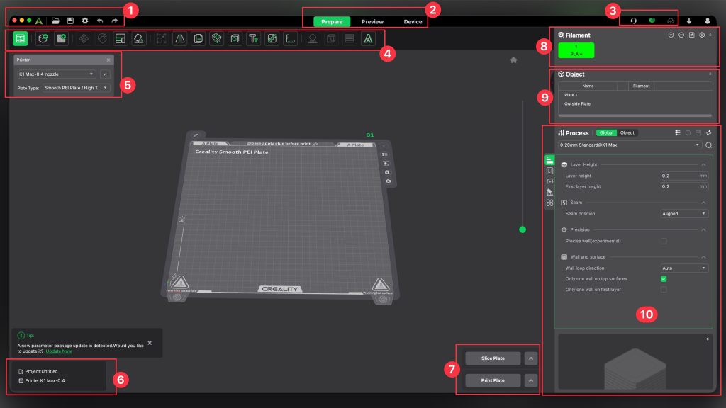 ตัวโปรแกรม Creality Print V5 ถูกออกแบบและพัฒนาต่อยอดมาจากโปรแกรม Open Source ที่ชื่อว่า Orca Slicer ซึ่งหน้าต่างและฟีเจอร์การทำงาน ก็จะใช้คล้ายๆกัน ถ้าใครเคยใช้ตัว Orca Slicer มาก่อน ก็สามารถที่จะใช้ตัว Creality Print V5 ได้เลย
