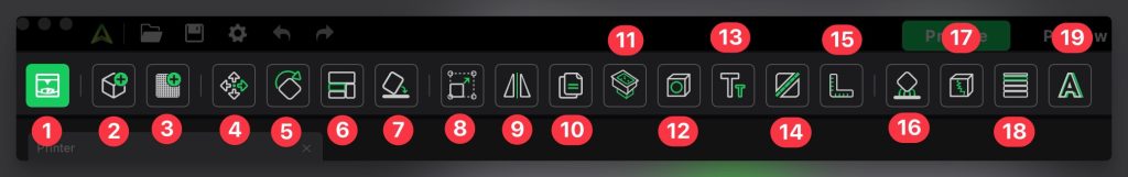 รวมเครื่องมือเกี่ยวก้บการจัดการโมเดล 3 มิติ เช่น การหมุน / ย่อ-ขยาย / กลับด้านโมเดล / ตัด / การสร้าง Support / การสร้างตัวหนังสือ และอีกหลายๆคำสั่ง จะถูกรวมไว้อยู่ในแทบ Tool Bar สามารถนำเมาส์ไปวางไว้บน Icon ทีต้องการ ตัวโปรแกรมก็จะแสดงคำสั่งเกี่ยวกับปุ่มนั้นขึ้นมา